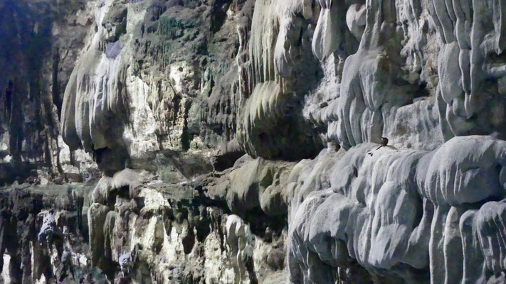 Von der Decke hängen Stalaktiten sowie Baumwurzeln bis tief in die Höhle hinein.